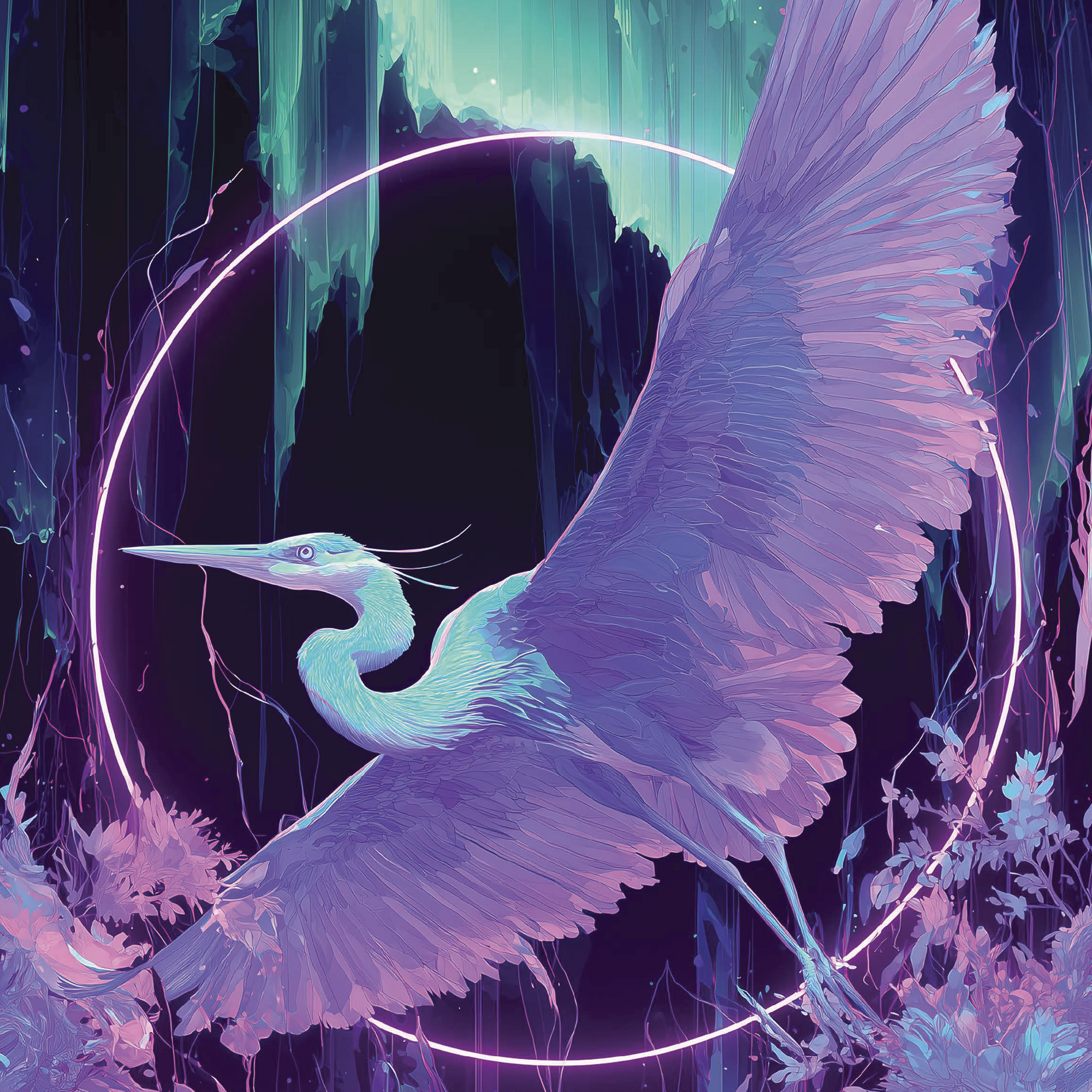 Glide into neon twilight with Aurora Soar, a luminous reimagining of the Pacific Northwest’s iconic great blue heron. Originally commissioned fo...