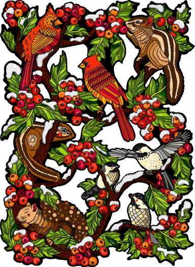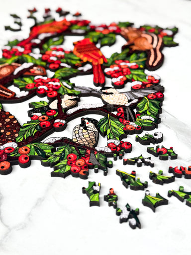 Take off into a dreamy holiday winterscape as you piece together this intricate line-cut puzzle featuring a festive papercut piece by Victoria-base...